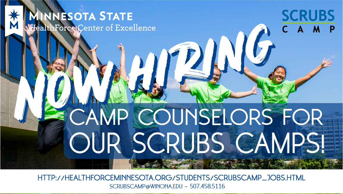 Join us and mentor groups of middle school and high school students all across Minnesota! There are openings for counselors in Winona, MN and the Twin Cities. It's a great way to spend a week or two or three at Scrubs Camp! You can apply to work for one, two, or even three or more camps!